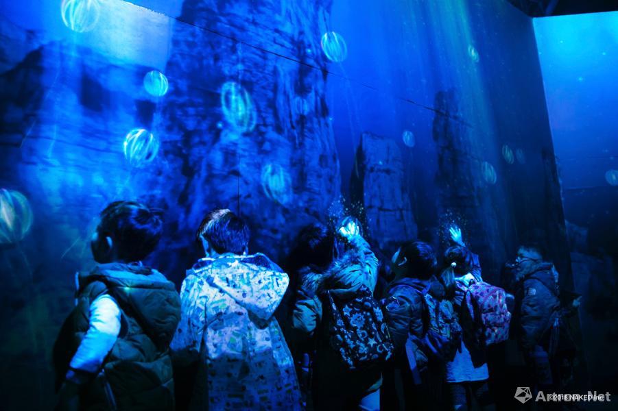 村松亮太郎:「AQUARIUM BY NAKED」是大人与孩子、男女老少都能够享受其中的展览。比如在mapping show「Oasis」,被鲸鱼吸引着潜入深海,孩子们能够接触到海底生物和深海里的雪「Marine Snow」,而大人则能一边欣赏充满幻想的故事一边沉浸在海底世界。此外,通过电子技术展现平时无法实现的效果也是这次展览的一个亮点,比如触摸墙壁就会出现水母,再或者在「Jelly Wall」这个展示前,能够体验到色彩和动作的变化,水母这种在海里完全无法违抗自然力学随波飘荡的生物在这里能够根据人为的操作自由变换。我想像这种在平时生活中无法经历的体验能够帮助培养孩子们自由的想象力和创造力。