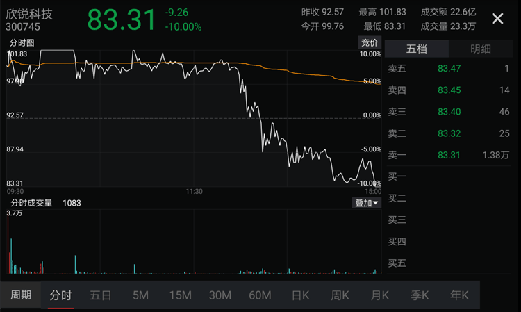 午后,多方资金宣布缴械投降,欣锐科技股价高台跳水,不到半小时内从上涨8%降至下跌5%。临近收盘,欣锐科技封死跌停,完成日内“天地板”的极端走势。