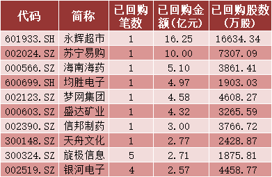 从今年实施回购的金额来看,排名前三的分别为永辉超市、苏宁易购和海南海药,回购金额分别为16.25亿元,10亿元和5.09亿元。此外,均胜电子、梦网集团、盛达矿业等35 家公司回购金额超过亿元,海联金汇、科达股份、中恒电气等26家公司回购金额超过5000万元。