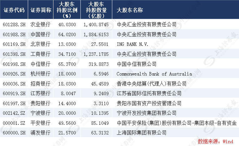 根据wind数据显示,今年一季度末,四大行中排名第一的大股东都是中央汇金投资有限责任公司,持股数分别约为1237.18亿股(持股比例34.71%)、1427.86亿股(持股比例57.11%)、1884.62(持股比例64.02%)、1400.87亿股(持股比例40.03%)。