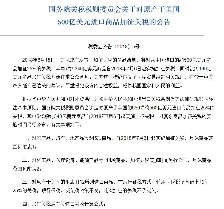 据悉,为捍卫自身合法权益,依据《中华人民共和国对外贸易法》等法律法规和国际法基本原则,商务部决定对同等规模原产于美国的农产品、汽车、水产品等进口商品对等采取加征关税措施,税率为25%,于北京时间6日12:01开始正式实施。
