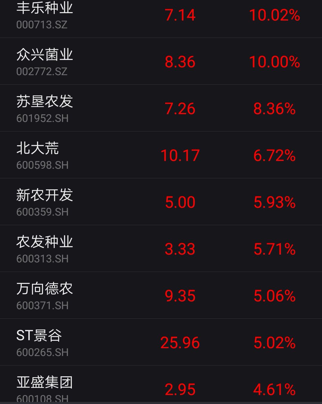 农业股尾盘直线拉升,丰乐种业、苏垦农发双双封涨停,北大荒大涨9%,农发种业、敦煌种业、登海种业纷纷跟涨。截止7月6日收盘,中信行业分类农林牧渔板块上涨1.52%,涨幅居于行业首位。