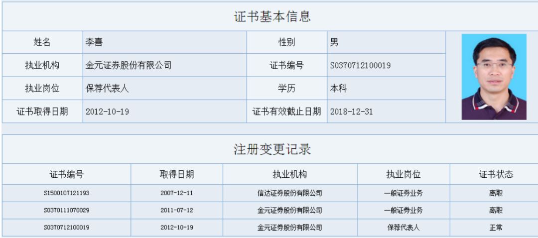 李喜目前就任金元证券保荐代表人岗位,学历为本科,曾任职信达证券,在2011年加入金元证券,2012年获得保荐代表人执业资格,从业证书有效期截至2018年12月31日。