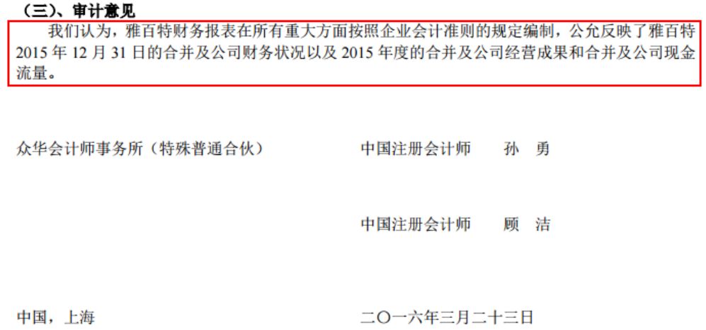 在2015年的年度报告中,众华会计事务所对雅百特出具了审计意见,认为“雅百特财务报表在所有重大方面按照企业会计准则的规定编制,公允反映了雅百特2015年12月31日的合并及公司财务状况以及2015年度的合并及公司经营成果和合并及公司现金流量”。