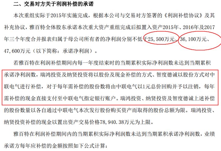 如果这一承诺没有达成,交易对手方需要以股份或现金的形式对中联电气进行补偿。