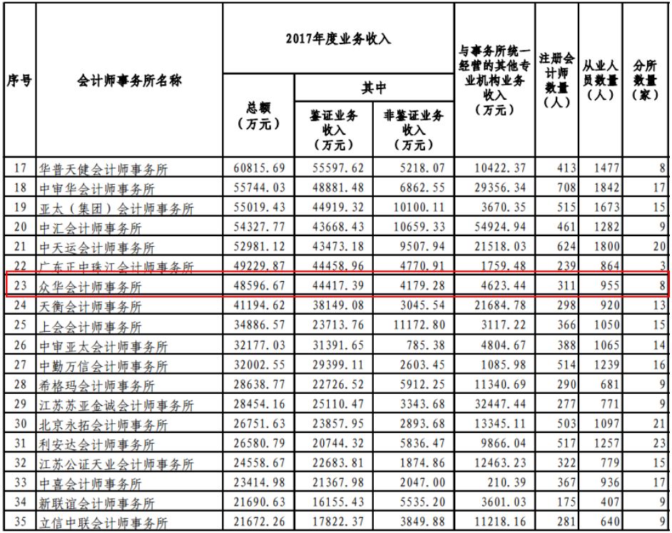 此外,在中注协发布的2017年业务收入前100家会计师事务所数据中,众华会计师事务所排名第23,在2017年的业务收入达到4.86亿元,事务所拥有注册会计师311人、从业人员数量达955人,共有8家分所。