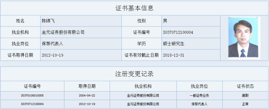 中证协公示信息显示,陈绵飞为硕士研究生学历,2004年入职金元证券,2012年获得保荐代表人执业资格,目前仍在金元证券任职,从业资格证书有效期截至2018年12月31日。