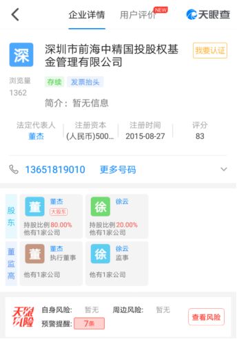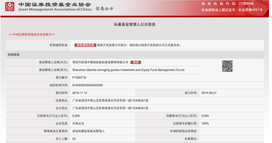 中国证券投资基金业协会公示信息显示,公司全名为“深圳市前海中精国投股权基金管理有限公司”,注册地为广东省深圳市,注册资本为5000万元,管理基金类别为“其他私募投资基金管理人”。协会登记的公司法定代表人为校华,担任公司总经理。