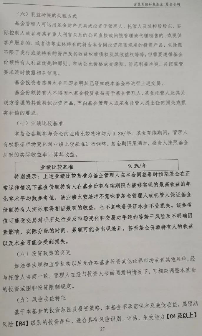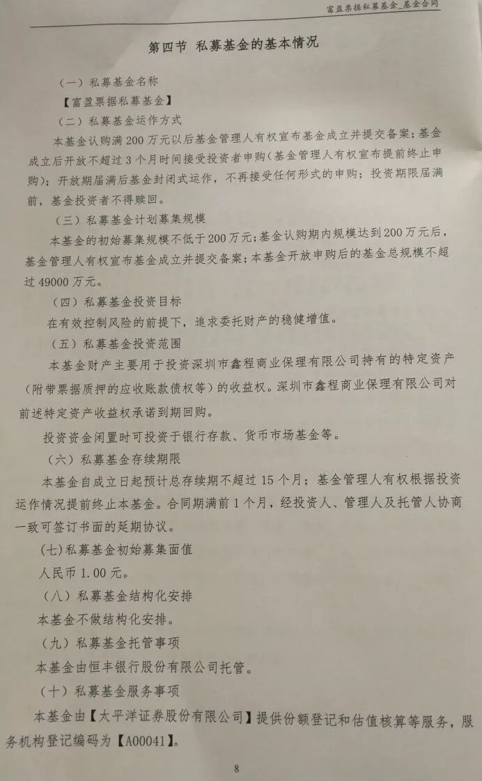 记者获得的一份“富盈票据私募基金”基金合同内容显示,该私募基金主要用于投资深圳市鑫程商业保理有限公司持有的特定资产(附带票据质押的应收账款债券等)的收益权,深圳市鑫程商业保理有限公司对该特定资产收益权曾诺到期回购,外滩控股集团对保理公司回购义务提供担保。除托管方为恒丰银行外,基金由太平洋证券提供份额登记和估值核算等服务。 合同约定基金比较基准为9.3%。