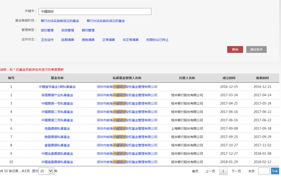 此外,协会私募基金备案信息显示,中精国投旗下共备案了10只产品,除“中精壹号基金1期私募基金”提前清算外,其余产品均显示为正在运作,从产品名称看,均为票据私募基金。运作产品中,有8只托管人为恒丰银行。