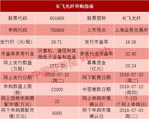 今天(7月10日)将迎来本周唯一一只新股申购——沪市主板的长飞光纤(申购代码:780869)。其发行价为26.71元/股,顶格申购需要22万元沪市市值。