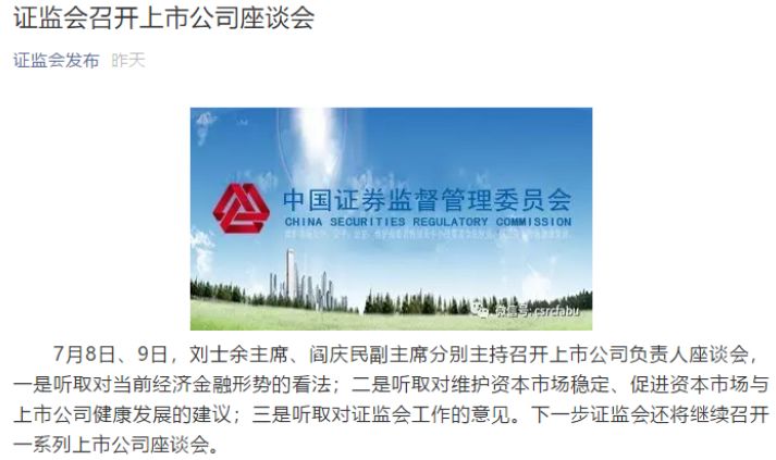 最值得关注的是,7月8日、9日,证监会主席刘士余、证监会副主席阎庆民分别主持召开上市公司负责人座谈会,一是听取对当前经济金融形势的看法;二是听取对维护资本市场稳定、促进资本市场与上市公司健康发展的建议;三是听取对证监会工作的意见。