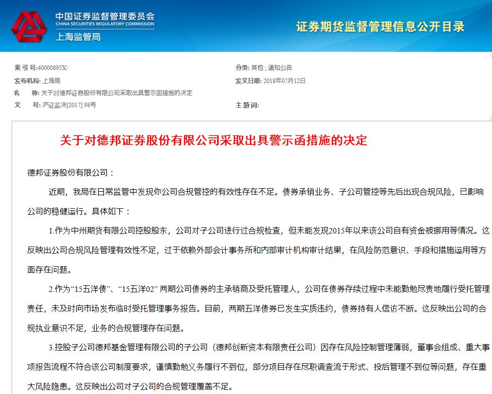 今天上午,上海证监局官网挂出一份对德邦证券的警示函,虽说落款为2017年11月14日,但事关五洋债,而大受关注。警示函中指出德邦证券合规管控的有效性存在不足,债券承销业务、子公司管控等先后出现合规风险。