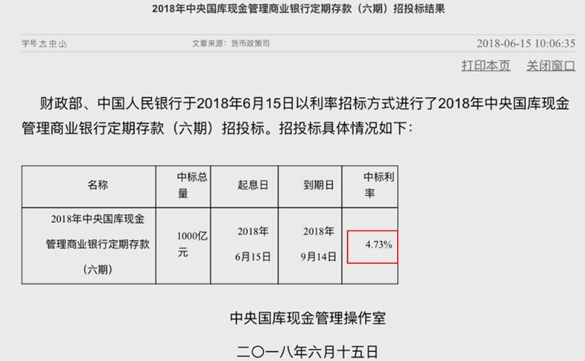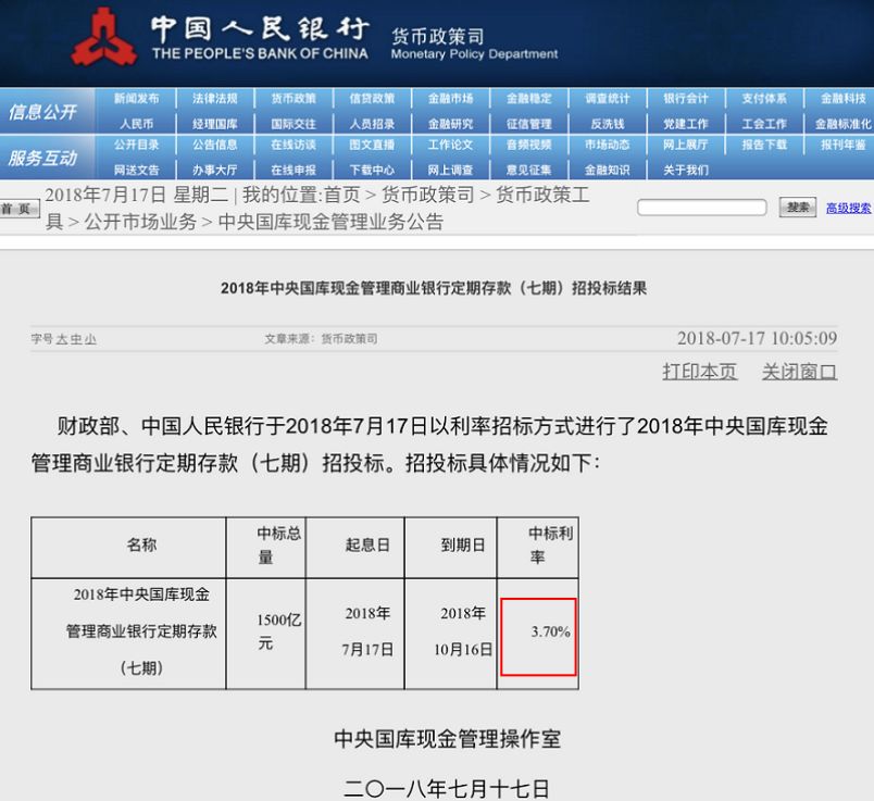今天(7月17日)上午10点,央行公布了“2018年中央国库现金管理商业银行定期存款(七期)招投标结果”,再次向市场发出了引导利率下行的重要信号。