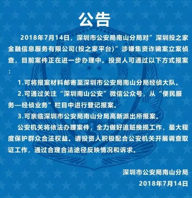 7月14日,深圳市公安局南山分局公告,对深圳投之家金融信息服务有限公司(投之家平台)涉嫌集资诈骗案立案侦查。