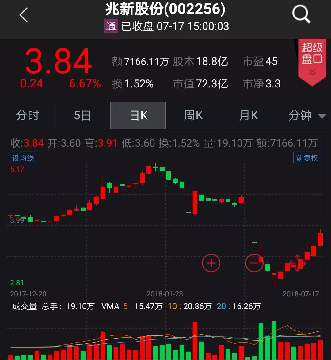 公司主营包括气雾剂系列产品和光伏发电等业务。在停牌四个月后,公司收购盐城星创和恒创睿能以失败告终,而此前大股东陈永弟宣布因个人原因辞去公司所有职务。7月2日复牌后,公司股价5个交易日大跌31.86%。随着股价下跌,十大股东之一的彩虹集团、大股东陈永弟质押的股票皆触及平仓线,另外公司于今年2月公布实施的第一期员工持股计划也触及平仓线。深圳宝信此时举牌,可谓“救世主”,公司股价自7月6日探底后,至今反弹幅度达23%。深圳宝信表示,增持是基于对兆新股份未来发展前景及投资价值的认可。此次权益变动完成后,不排除在未来十二个月内继续增加或减少其在公司中拥有权益股份的可能。