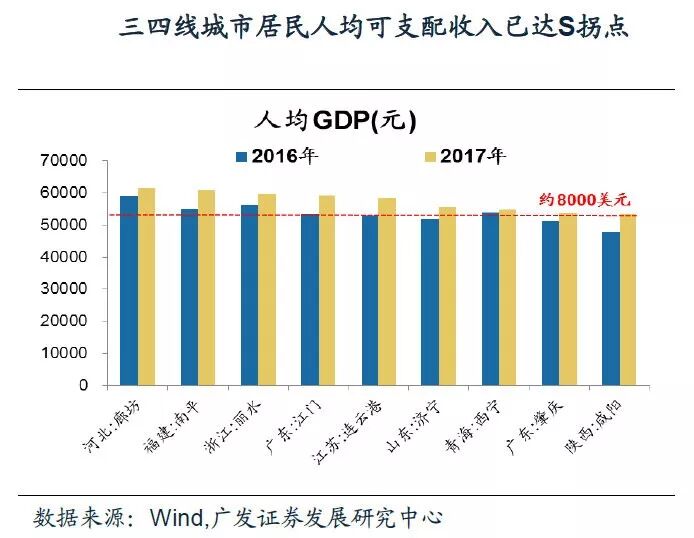 广发证券表示,两大长期逻辑支撑大众消费板块行情。首先是人口收入“S 曲线效应”及中国经济增长动能的转变。中国正在经历年龄、收入、教育水平的动态衍变,人口红利与“S 曲线效应”助推消费升级。在经济“去杠杆”背景下,中国正在告别依赖债务刺激投资的增长模式,消费支出的贡献持续提升。其次是三四线城市人口的再聚集效应。三四线城市人口呈现回流态势,一线城市的溢出人口会带来三四线消费倾向的惯性,有助于推动三四线城市的消费格局与品质提升。2017 年三四线城市人均 GDP 已触及“S 曲线效应”拐点,消费升级效应加速,2016-2017年三四线房价上涨带来的“财富效应”提高居民购买力,同时地产对商圈的“后辐射”效应也会带来消费供给端企业的渠道下沉加速。