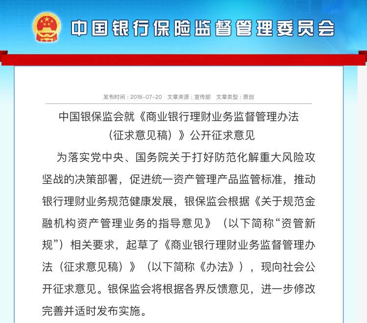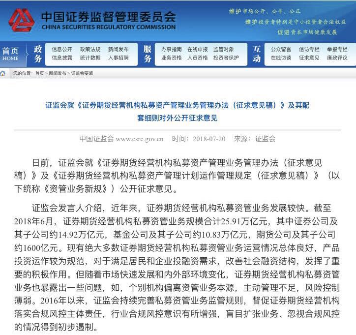 7月20日,先是银保监会发布《商业银行理财业务监督管理办法(征求意见稿)》;接下来央行发布《关于进一步明确规范金融机构资产管理业务指导意见有关事项的通知》;随后证监会于昨日晚间也发布《证券期货经营机构私募资产管理业务管理办法(征求意见稿)》。