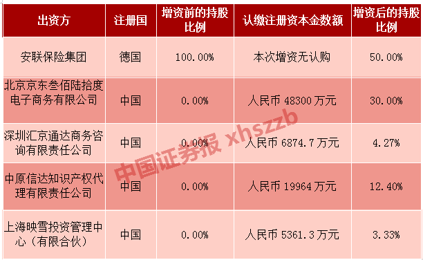 其中,北京京东叁佰陆拾度电子商务有限公司(简称“京东”)认购新增注册资本中的4.83亿元,增资后持股达30%;中原信达知识产权代理有限责任公司认购新增注册资本中的1.9964亿元,增资后持股12.4%;深圳汇京通达商务咨询有限责任公司、上海映雪投资管理中心(有限合伙)分别认购新增注册资本中的6874.7万元、5361.3万元,增资后持股比例分别为4.27%、3.33%;安联保险持股比例则由100%降至50%。