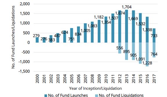2012年之后,全球对冲基金每年新增基金公司数量逐年递减。2017年新增对冲基金公司数量为过去15年来新低。导致对冲基金公司数量增长放缓的原因包括:美国政治经济环境面临较大不确定性;英国脱欧;投资者投资对冲基金越来越谨慎等因素。