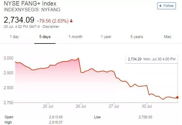随着多家科技巨头陆续披露的二季报不及预期,它们的股价开始持续走弱。由科技股翘楚共同组成的纳斯达克指数在触及7511.39点的历史新高后,已连续三天跌逾1%。而纽交所备受关注的“FANG+指数”30日下滑超过2.8%。