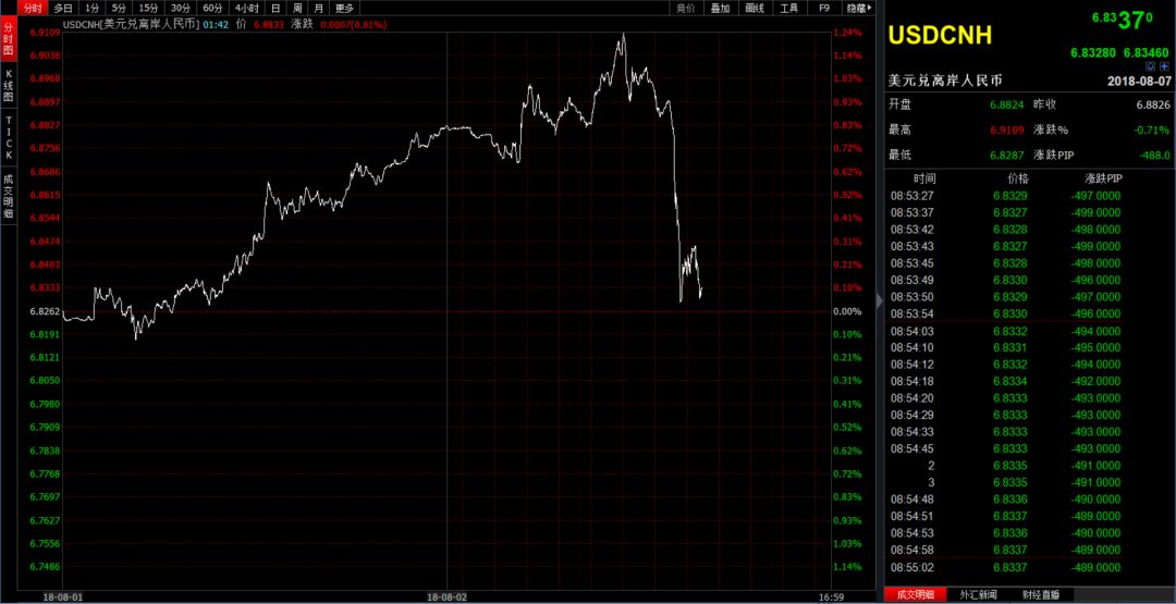 8月3日,离岸人民币兑美元盘中跌破6.9这一重要关口,最高报6.9109点。