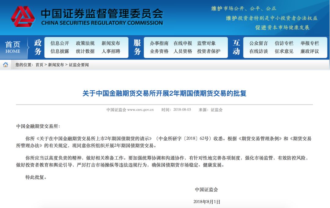 中国证监会新闻发言人常德鹏8月3日表示,证监会已于近日批准中国金融期货交易所开展2年期国债期货交易,合约正式挂牌交易时间为2018年8月17日。