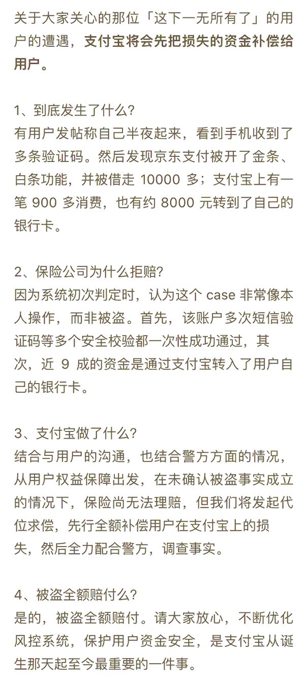 支付宝表示,会全额补偿用户损失(参见下图)。支付宝数据显示,目前的交易资损率不到百万分之一。
