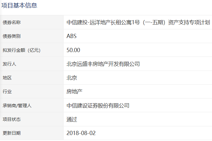 上周,深交所审核通过了2只ABS,总额60亿元,其中1只为“中信建投-远洋地产长租公寓1号(一-五期)资产支持专项计划”,拟发行总规模50亿,发行人为北京远盛丰房地产开发有限公司。