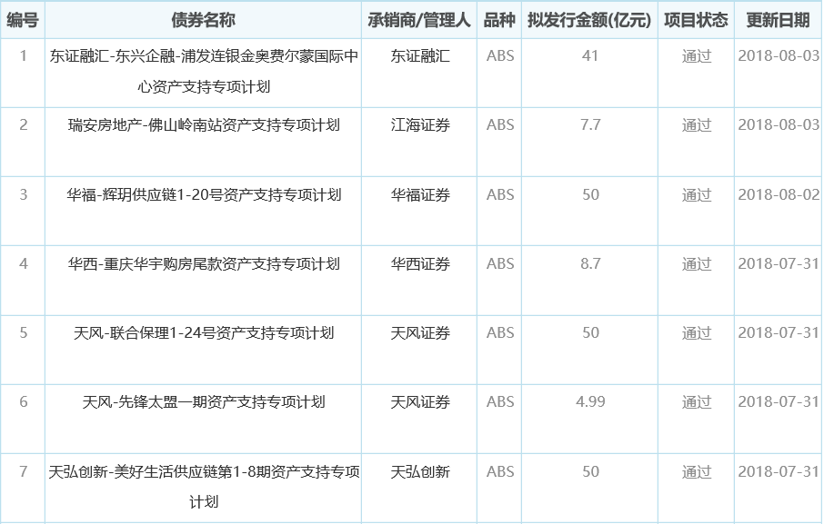 东证融汇-东兴企融-浦发连银金奥费尔蒙国际中心资产支持专项计划,拟发行41亿元,发行人为南京金高房地产开发有限公司;华西-重庆华宇购房尾款资产支持专项计划,拟发行8.7亿元,发行人为重庆华宇集团有限公司;天弘创新-美好生活供应链第1-8期资产支持专项计划,拟发行规模50亿元,发行人为重庆市金科商业保理有限公司。