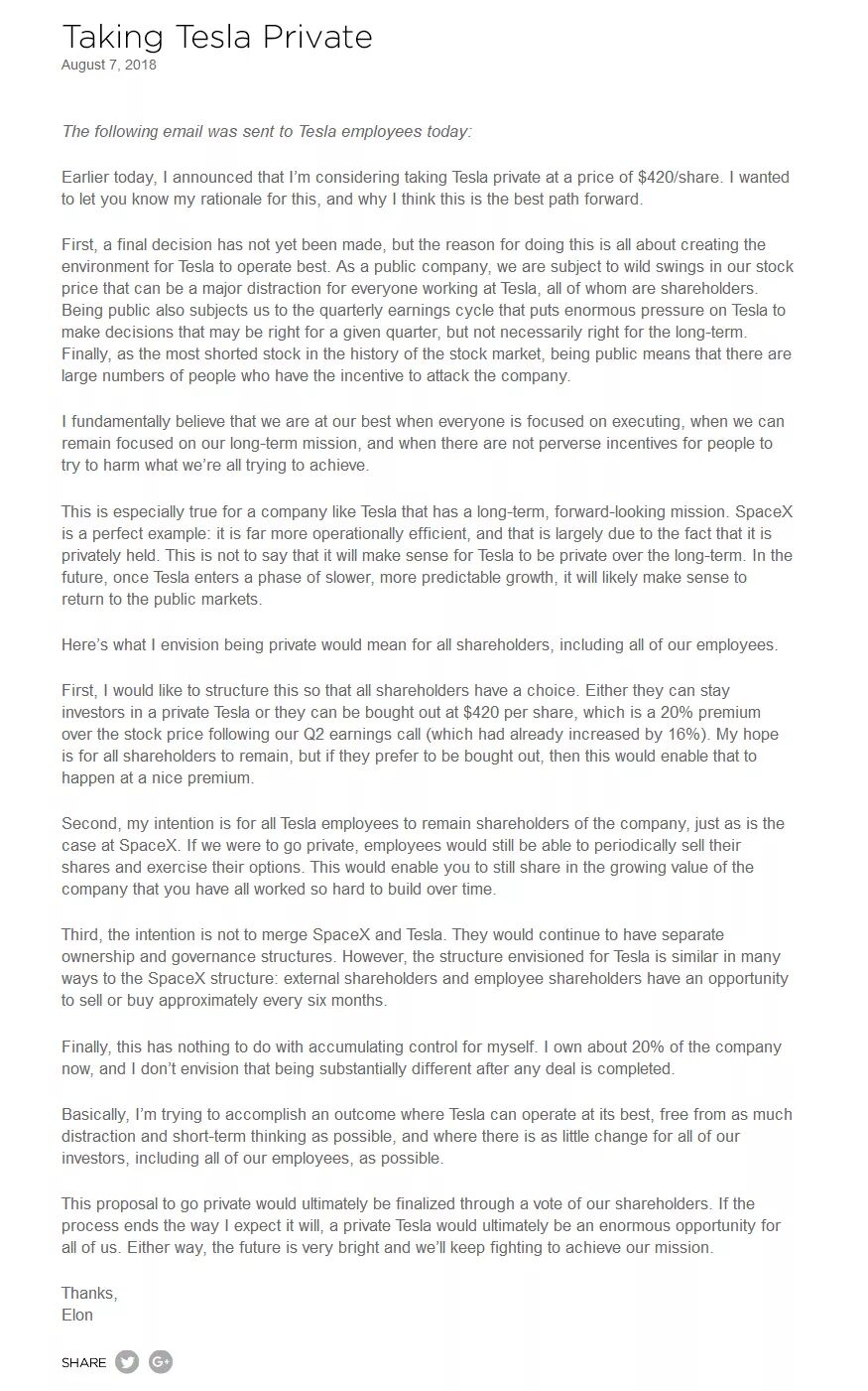 1.给投资者选择的权利,要么继续投资私有化的特斯拉,要么以每股420美元的的价格出售股份,这一价格比Q2财报的电话会议后的股价高出了20%。
