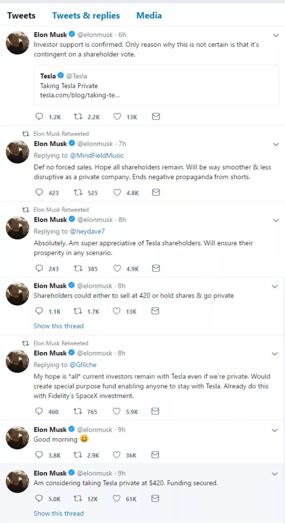 随后马斯克连发数条推特,忙得不可开交,一会希望特斯拉股东保持忠诚,一会回复收购目标价是420美元。