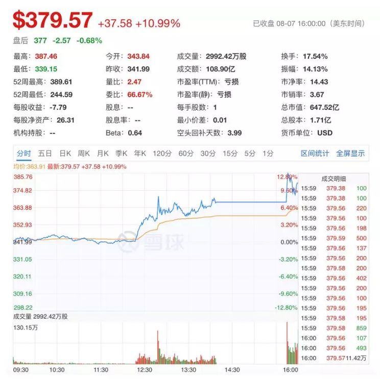 在收盘时间前一度高达381.27美元,最终以379.57美元收盘。全天股价上涨达37.58美元,幅度为10.99%。同时,股票成交量超过2980万股,是特斯拉日均成交量的3倍多。