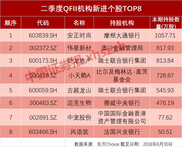 数据显示,QFII二季度新进8家公司前十大流通股东,五只个股持股均在500万股以上。安正时尚分别被摩根大通银行与汇丰中华证券投资信托股份有限公司两大QFII机构同时新进持有。