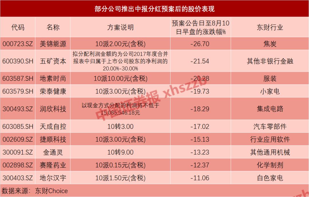 不过,不少公司在推出分红方案后,股价依旧下跌。如美锦能源,7月25日晚,公司推出“10派2.00元(含税)”方案,7月31日复牌,公司股价跌停,目前累计下跌约26%。五矿资本、地素时尚、荣泰健康、润欣科技等公司亦是如此。