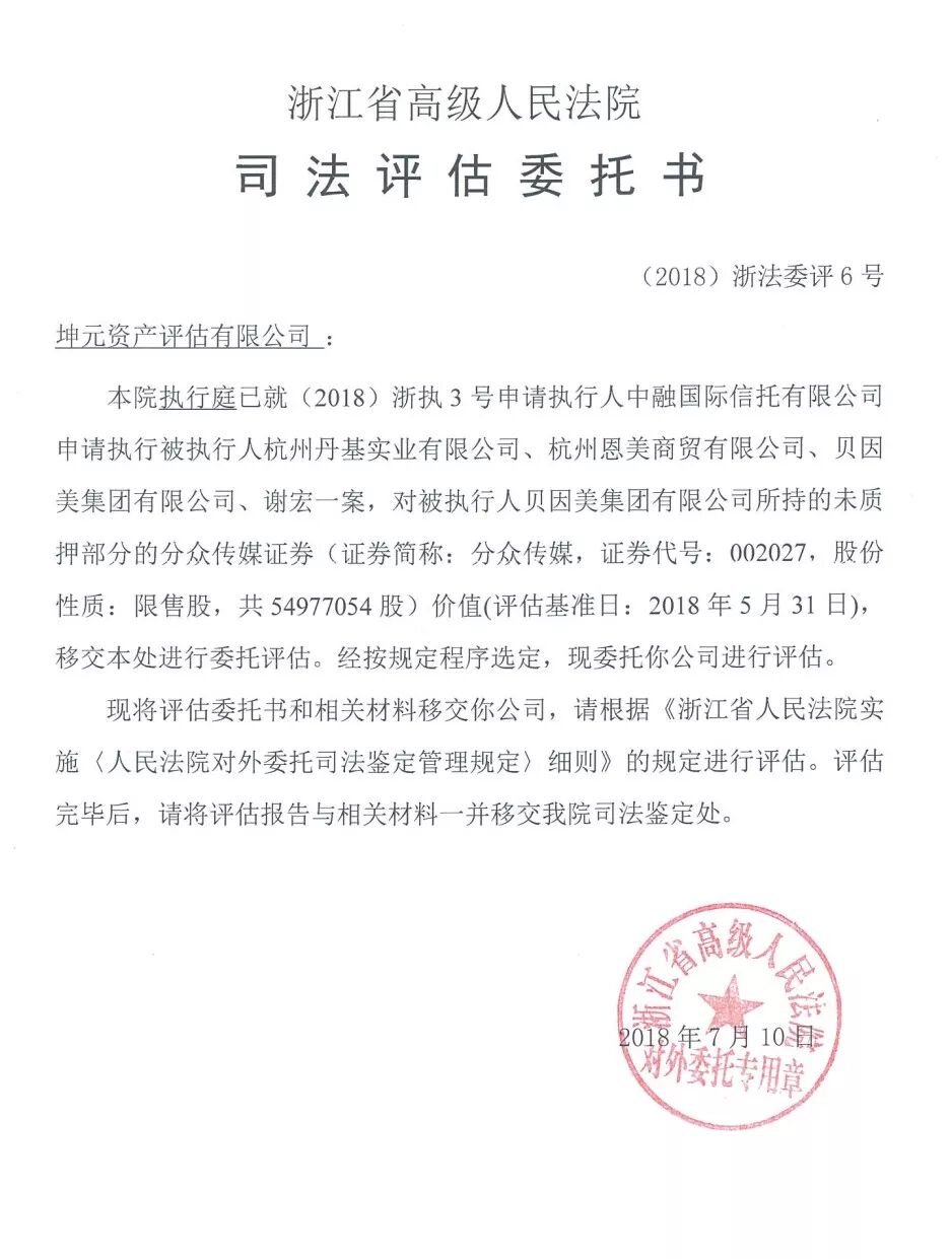 浙江高院委托坤元资产评估有限公司对贝因美集团在评估基准日2018年5月31日所持有的分众传媒(限售流通股,含评估基准日后产生的孳息)5497.71万股股权的市场价值,进行了评估,评估价值为5.61亿元。