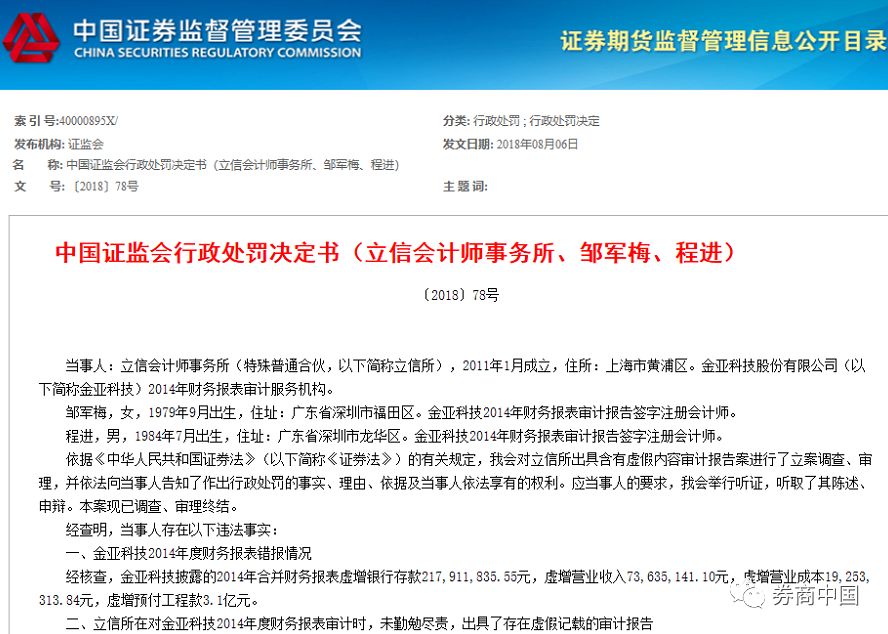 经查明,立信会计师事务所签字注册会计师邹军梅、程进在金亚科技2014年财务报表审计过程中未勤勉尽责,出具的审计报告存在虚假记载。证监会决定,没收立信所业务收入90万元,并处以270万元的罚款,对邹军梅、程进给予警告,并分别处以10万元顶格罚款。据证监会已公布信息,今年以来已经有两家审计机构被依法作出行政处罚。