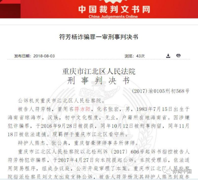 随后,主角登场了。2008年12月至2009年8月,符芳杨伙同马宝元先后在重庆市江北区西普大厦、渝中区太极大厦、开州区开州大道中段X号租赁场地对外开展股票投资咨询等业务。资料显示,符芳杨,男,1983年7月15日出生于海南省琼海市,初中文化,无业。