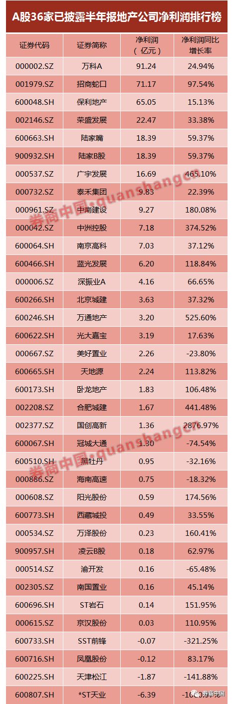 截至目前,A股已有36家房地产企业发布了半年报业绩, 28家净利润同比增长,占比达77.8%;其中,万通地产、广宇发展、合肥城建、中洲控股净利润增长超过3倍,共有13家净利润同比增长超过100%,19家净利润同比增长超过50%。