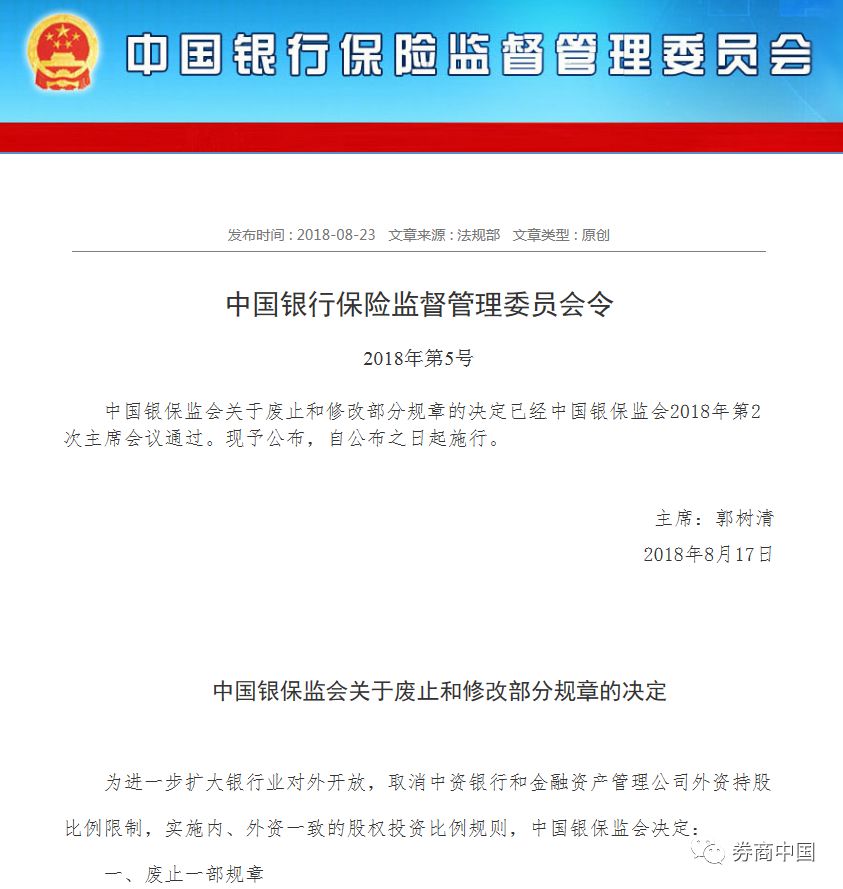 值得注意的是,此次银保监会发布最新的银行业对外开放举措,实则是延续了今年2月原银监会发布的《中国银监会关于修订<中国银监会外资银行行政许可事项实施办法>的决定》的政策要求。