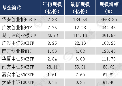 其中,最受瞩目的华安创业板50ETF份额较年初大幅增长了45倍。另外,还有多只追踪创业板和中证500指数的ETF规模增幅也超过了100%。