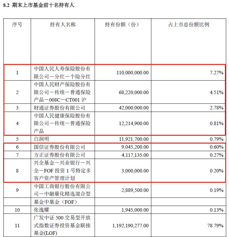 基金半年报显示,中国人民人寿保险、中国人民财产保险、中国人民健康保险等三家保险公司持有基金份额分别占比7.27%、4.51%、0.81%。另外,财通证券、国信证券、方正证券、兴全基金旗下的客户资管计划以及中融量化精选混合也出现在前十大持有人名单上。