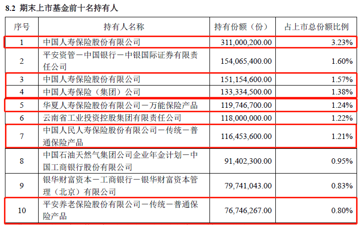 以华安创业板50ETF为例,最新披露的基金半年报显示,截至上半年末,基金前十大持有人中出现了中国人寿、华夏人寿、平安养老保险等多家保险公司,而在去年年底,华安创业板50ETF的前十大持有人中除了三家券商,其余均为个人投资者。
