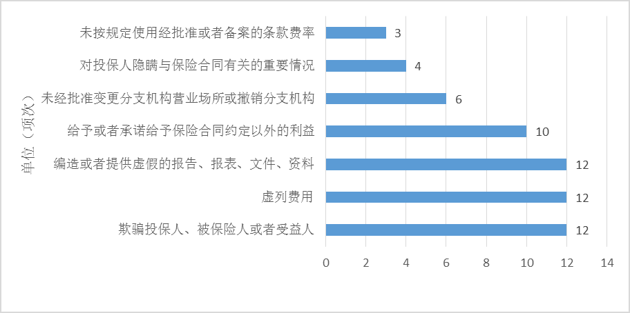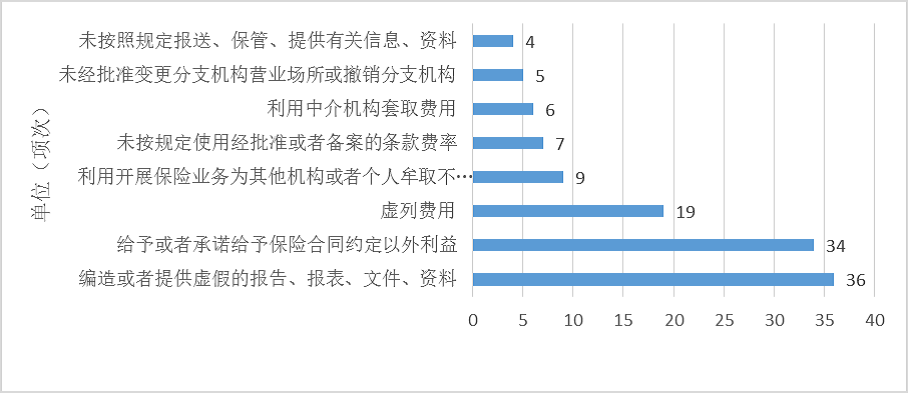 编造或者提供虚假的报告、报表、文件、资料;给予或者承诺给予保险合同约定以外的利益;虚列费用;利用开展保险业务为其他机构或者个人牟取不正当利益;未按规定使用经批准或者备案的条款费率;利用中介机构套取费用;未经批准变更分支机构营业场所或撤销分支机构;未按照规定报送、保管、提供有关信息、资料。