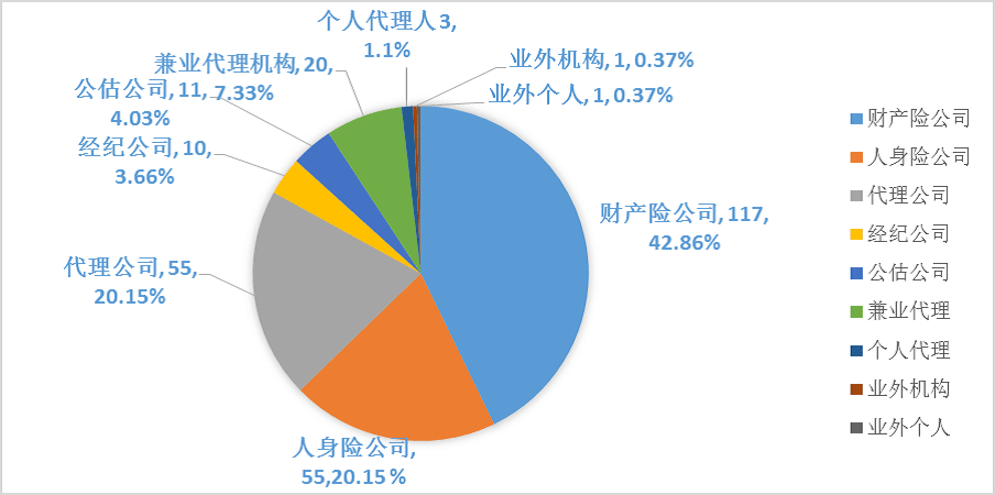 在被处罚的273家次机构中,财产险公司有117家次,占比42.86%;人身险公司55家次,占比20.15%;保险代理公司55家次,占比20.15%;保险经纪公司10家次,占比3.66%;保险公估公司11家次,占比4.03%;兼业代理机构20家次(其中银保渠道14家),占比7.33%;个人代理人3人,占比1.1%,业外机构1家,占比0.37%,业外个人1人,占比0.37%。