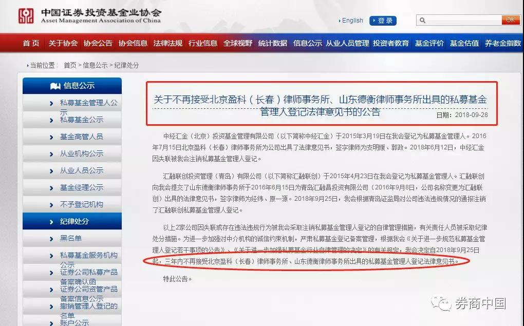 9月28日,基金业协会网站上一则《关于不再接受北京盈科(长春)律师事务所、山东德衡律师事务所出具的私募基金管理人登记法律意见书的公告》纪律处分公告,在行业内引发巨大关注。