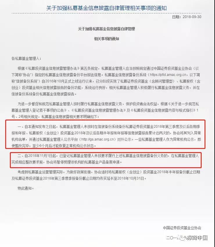 昨日晚间,中国基金业协会发布通知称,自9月30日起,私募基金管理人未按时在信披备份系统备份报送,累计达两次的,协会将其列入异常机构名单。其中要求私募证券基金按时报送季报和年报、私募股权基金 (含创业)按时报送半年报和年报。