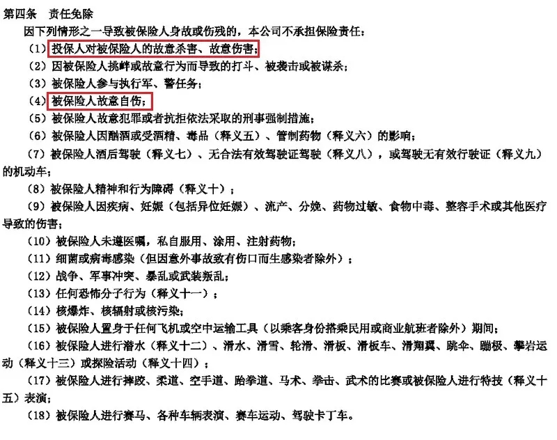在保险合同中都有“责任免除”部分,其中列举的条款都是保险公司不赔付的,“故意杀害”“故意自伤”都包含其中。