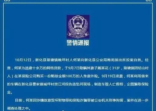 湖南新化县34岁的何某欠下十余万元的网络贷款,9月7日他隐瞒妻子戴某花在某保险公司购买一份赔偿金额为100万元的人身意外险。