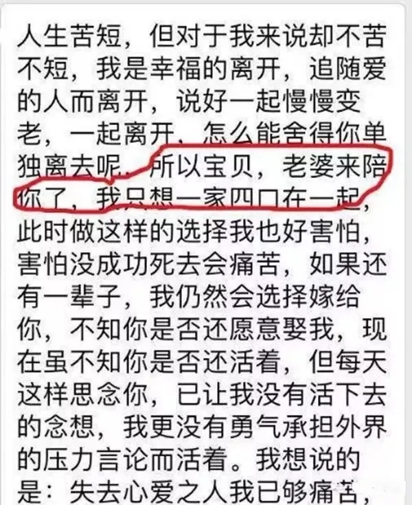10月10日,31岁的戴某花在朋友圈留下遗书,称“追随爱的人儿离开”“只想一家四口在一起”“已让我没有活下去的念想”……带着4岁的儿子和3岁的女儿自杀。